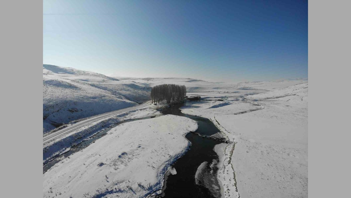 Kars'ta kış mevsimi tüm ihtişamıyla etkisini gösterirken, karla kaplı araziler arasından sessizce süzülen Kars Çayı, görenleri kendine hayran bırakıyor. Beyaz örtüyle kaplanan doğanın içinden kıvrılarak akan çay, adeta bir kartpostal görüntüsü sunuyor.
