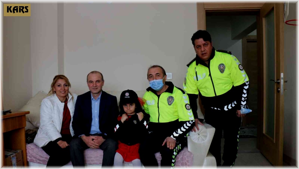 Kars'ta polis, kayan otomobilin altında kalmaktan son anda kurtardığı kız çocuğunu evinde ziyaret etti.