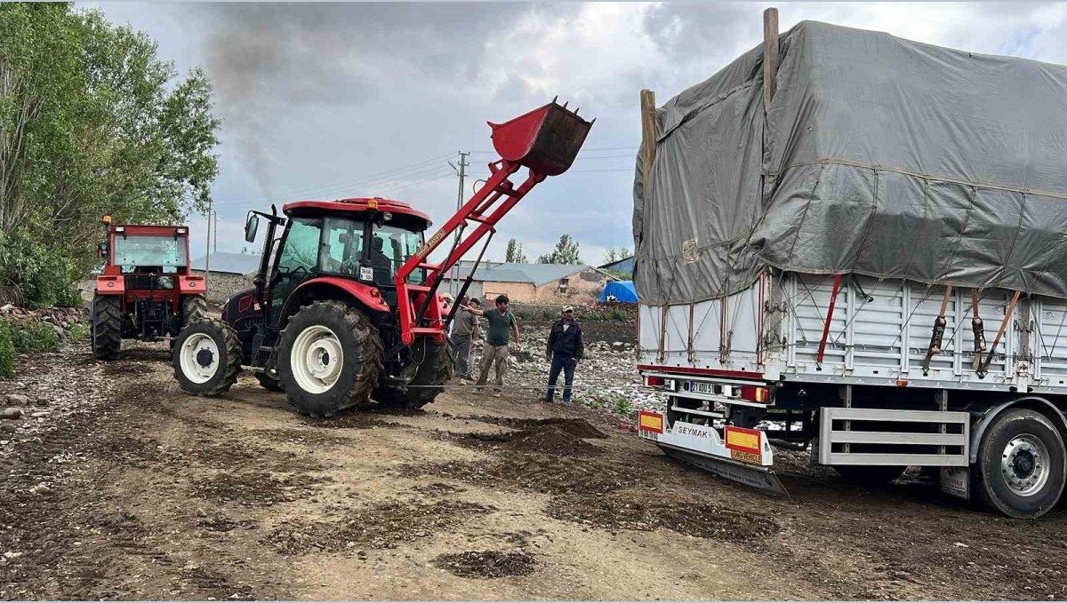 KARS (İHA) - Kars'ın Arpaçay ilçesine bağlı Karakale köyüne saman götüren tır, köy girişinde çamura saplandı. Tırın çamura saplandığı gören köylüler seferber oldu. Traktörleriyle bölgeye gelen köylüler, önce çamurun üzerine traktörün kepçesiyle kum serdi. Daha sonra tırı çıkarmak için çalışma başlattı.