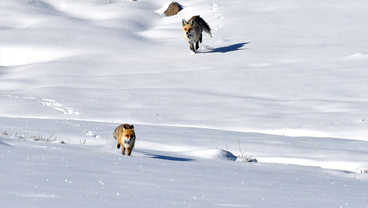 İlçeye 3 kilometre uzaklıkta Soğuksu bölgesindeki karlı arazide gezinen ve zaman zaman yiyecek arayan kızıl tilkiler görüntülendi.