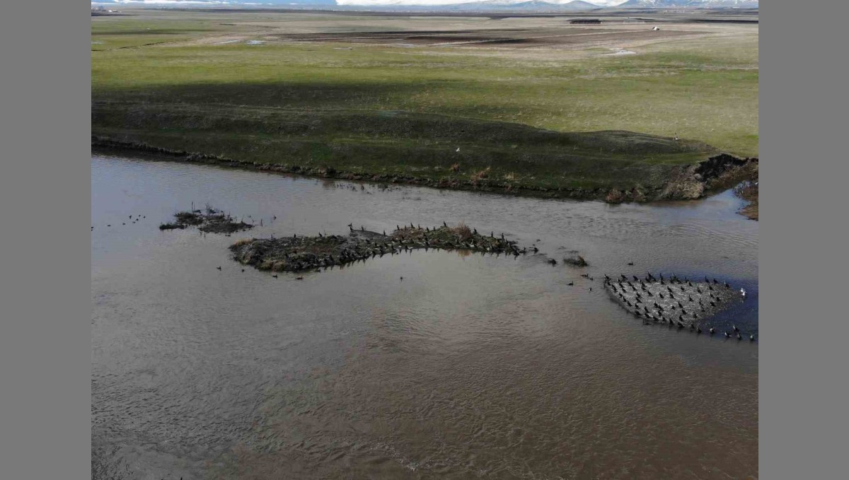 Kars'a gelirken yorgun düşen ve Kars Çayı'nda oluşan adacıklarda dinlenen karabataklar, havadan görüntülendi. Bir süre dinlenen karabataklar, daha sonra yazı geçirecekleri bölgeye kanat çırptı.