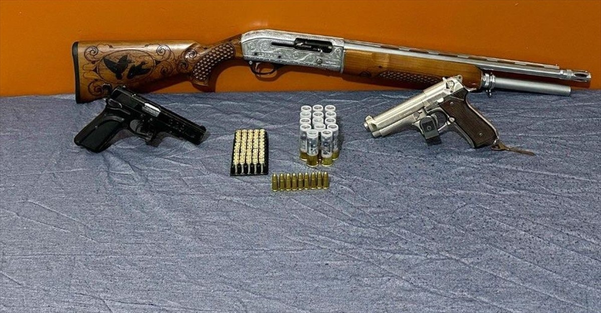 Adresinde 2 ruhsatsız tabanca, 2 tabanca şarjörü, 59 tabanca fişeği, 1 av tüfeği, 14 av tüfeği fişeği ele geçirilen şüpheli E.A. gözaltına alındı.
