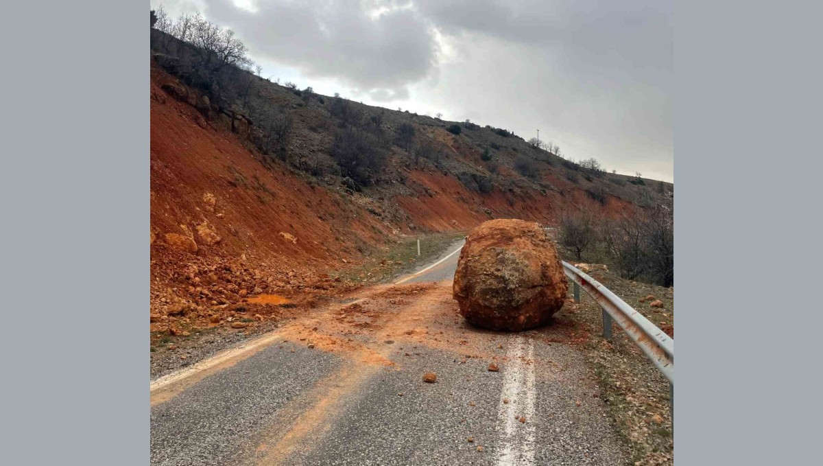 Tunceli'nin Çemişgezek ilçesinde, sağanak yağmur nedeniyle dağdan kopan devasa büyüklükteki kaya yola yuvarlandı.