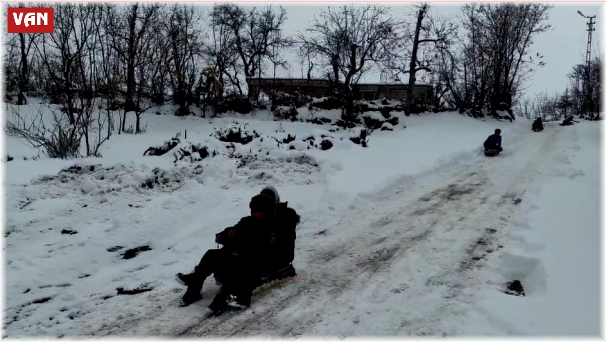 Van'ın Gevaş ilçesinde kar yağışını fırsat bilen çocuklar, kendi imkanlarıyla yaptıkları kızaklarla cadde ve sokaklarda kayarak eğlendi.