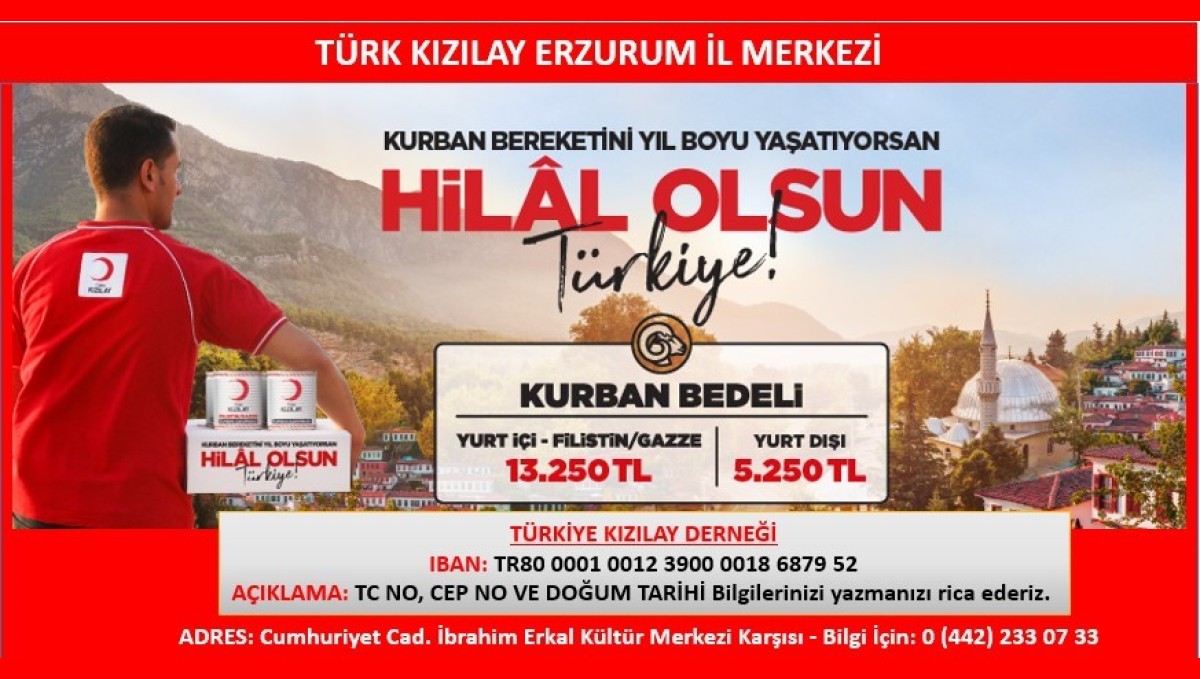 ERZURUM (İHA) - Hayırseverlere bu yıl da "Kurban Bereketini Yıl Boyu Yaşatıyorsan Hilal Olsun Türkiye!" sloganıyla seslenen Kızılay, 2025 yılı vekâlet bedellerini de kamuoyuyla paylaştı. Kampanyaya verilen kurban vekaletleri başta Türkiye, Gazze ve Filistin olmak üzere dünyanın dört bir yanındaki ihtiyaç sahiplerinin sofralarını bereketlendirecek.