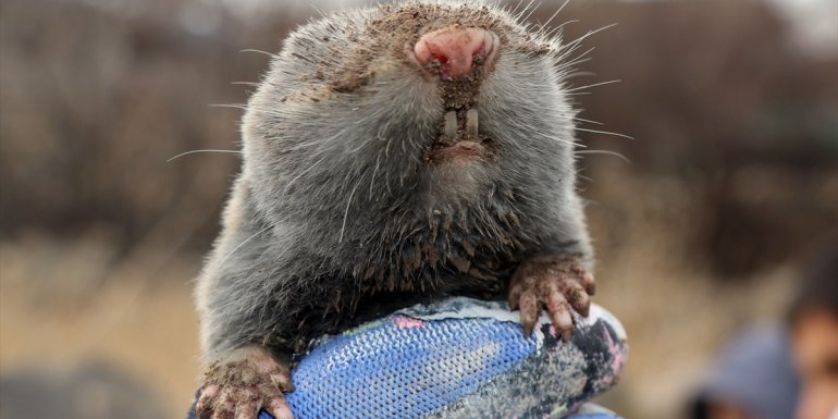 Kemirgenler ailesinden olan, bitki kökü ve böceklerle beslenen, toprağı kazarken oluşturduğu toprak kümeleriyle bilinen kör farenin bir süre sonra toprağın derinliklerine girerek gözden kaybolması Anadolu Ajansı muhabirince görüntülendi.