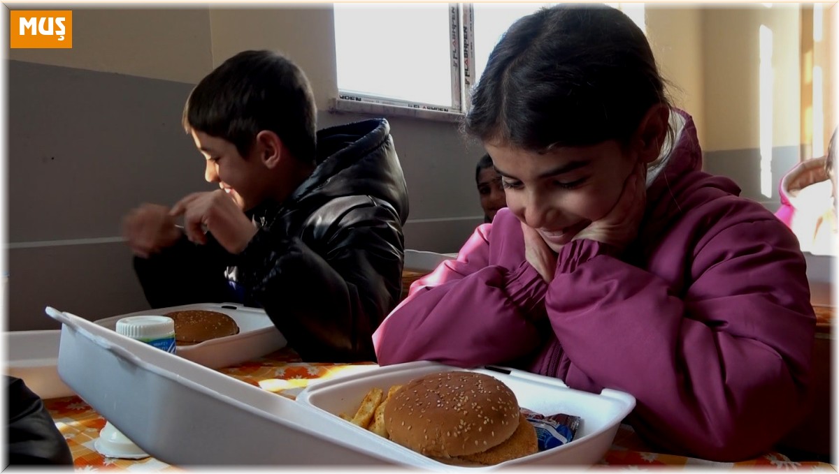 Muş'a 50 kilometre uzaklıktaki Gündoğan köyünde yaşayan çocuklar, hayatlarında ilk kez hamburger yedi.