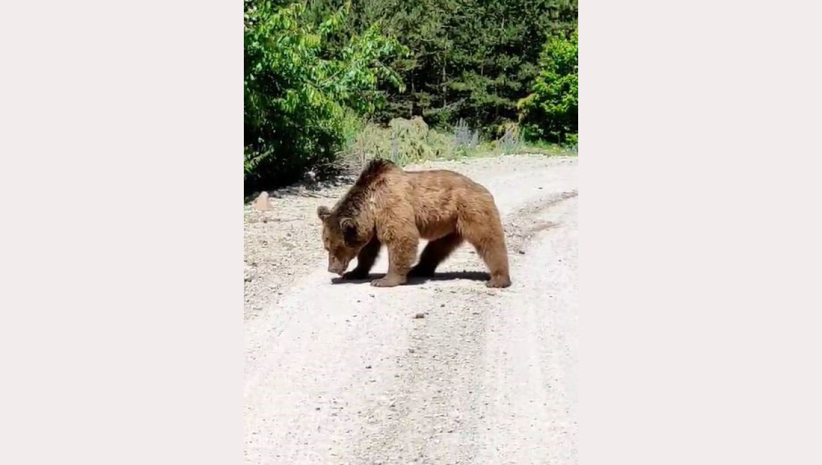 Sıcaktan bunaldığı gözlenen boz ayı bir süre sonra yoldan çıkarak ormanlık alan girdi ve gözden kayboldu