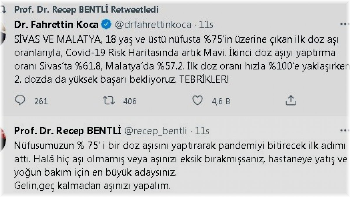 Bu arada, Malatya'nın aşıda sarıdan mavi kategoriye yükselmesi Sağlık Bakanı Dr. Fahrettin Koca'nın tebrik etmesine neden oldu. Bakan Koca, sosyal medya hesabında yaptığı açıklamada, "Sivas ve Malatya, 18 yaş ve üstü nüfusta yüzde 75'in üzerine çıkan ilk doz aşı oranlarıyla, Covid-19 Risk Haritasında artık Mavi. İkinci doz aşıyı yaptırma oranı Sivas'ta yüzde 61.8, Malatya'da yüzde 57.2. İlk doz oranı hızla yüzde 100'e yaklaşırken 2. dozda da yüksek başarı bekliyoruz" diye konuştu.