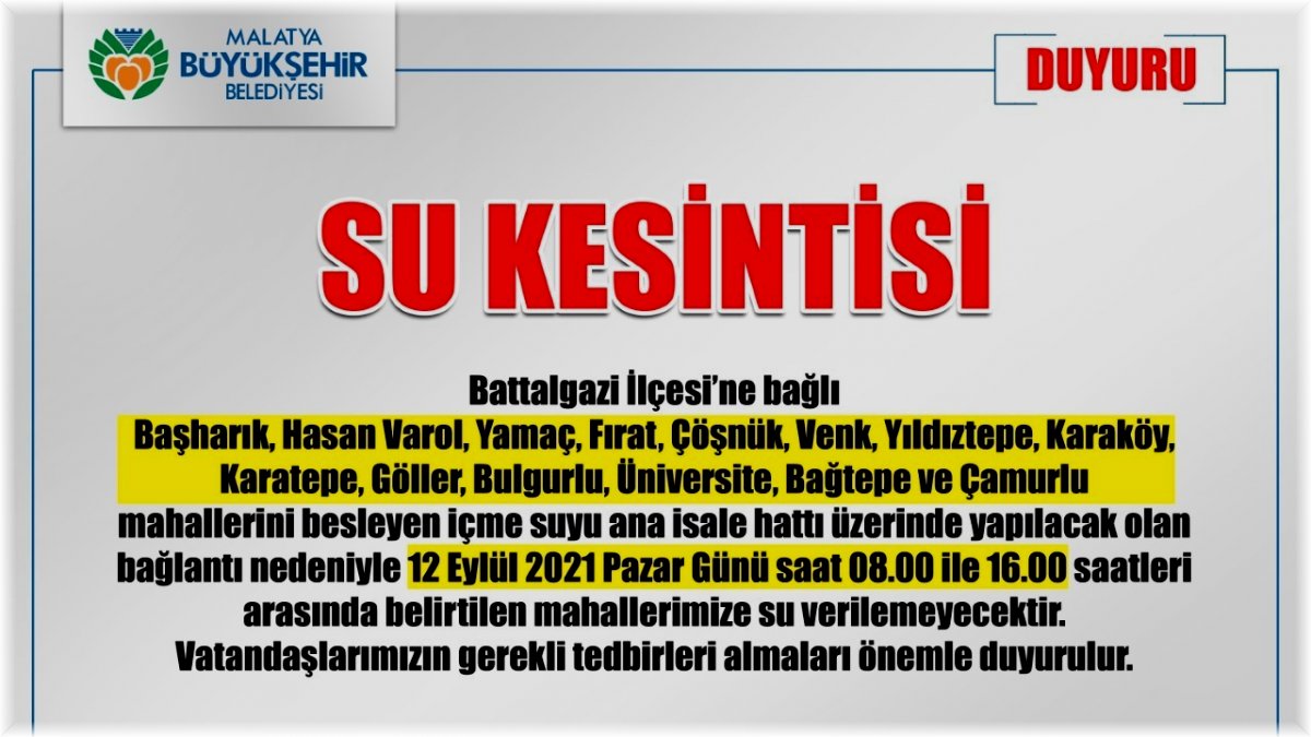MASKİ Genel Müdürlüğü’nden yapılan açıklamada, “Battalgazi İlçesi’ne bağlı Başharık, Hasan Varol, Yamaç, Fırat, Çöşnük, Venk, Yıldıztepe, Karaköy, Karatepe, Göller, Bulgurlu, Üniversite, Bağtepe ve Çamurlu mahallerini besleyen içme suyu ana isale hattı üzerinde yapılacak olan bağlantı nedeniyle 12 Eylül 2021 Pazar Günü saat 08.00 ile 16.00 saatleri arasında belirtilen mahallerimize su verilemeyecektir. Vatandaşlarımızın gerekli tedbirleri almaları önemle duyurulur" denildi.