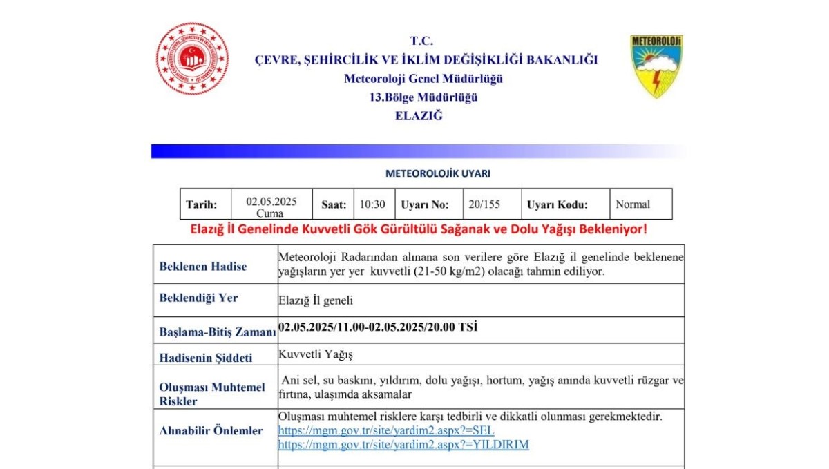 ELAZIĞ (İHA) - Meteoroloji 13. Bölge Müdürlüğü'nden yapılan açıklamada, "Meteoroloji Radarından alınana son verilere göre Elazığ il genelinde beklenene yağışların yer yer kuvvetli (21-50 kg/m2) olacağı tahmin ediliyor. Ani sel, su baskını, yıldırım, dolu yağışı, hortum, yağış anında kuvvetli rüzgar ve fırtına, ulaşımda aksamalara karşı tedbirli ve dikkatli olunması gerekmektedir" denildi.