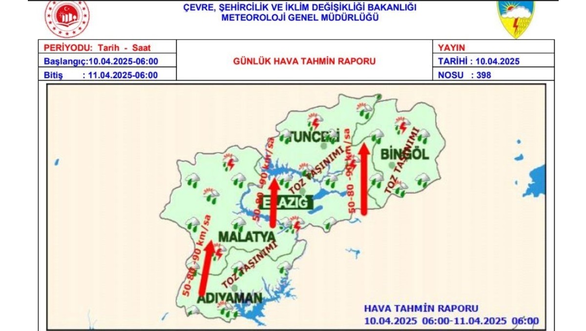 Meteoroloji 13. Bölge Müdürlüğü Elazığ, Malatya, Bingöl, Adıyaman ve Tunceli için rüzgar, toz taşınımı ve dolu uyarısında bulundu.