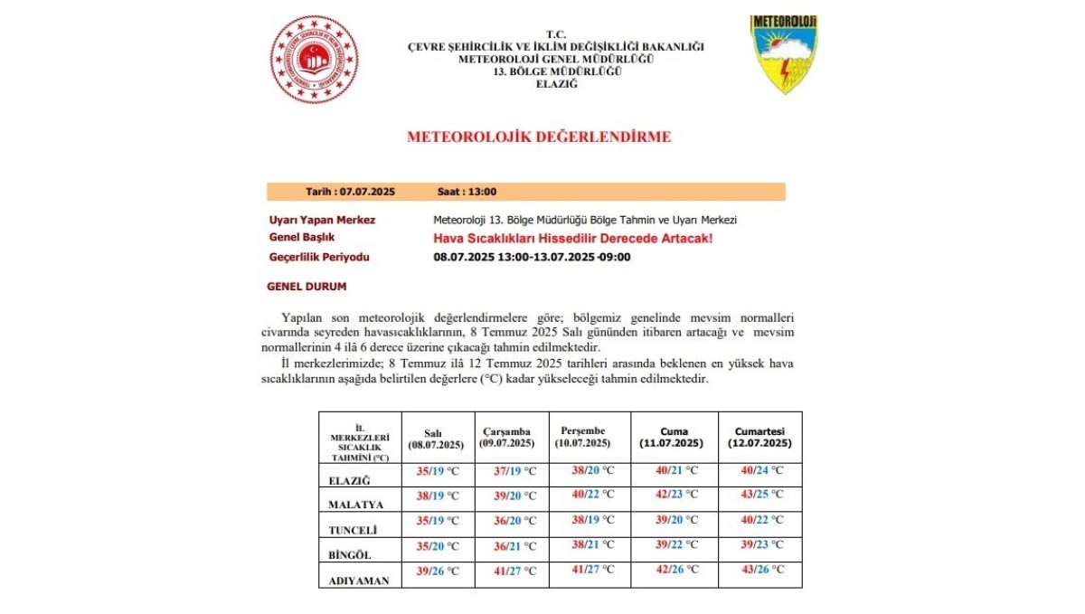Meteoroloji 13. Bölge Müdürlüğü; Elazığ, Malatya, Bingöl, Tunceli ve Adıyaman için uyarı yaparak hava sıcaklıklarının salı gününden itibaren artacağı ve mevsim normallerinin 4 ila 6 derece üzerine çıkacağını bildirdi.