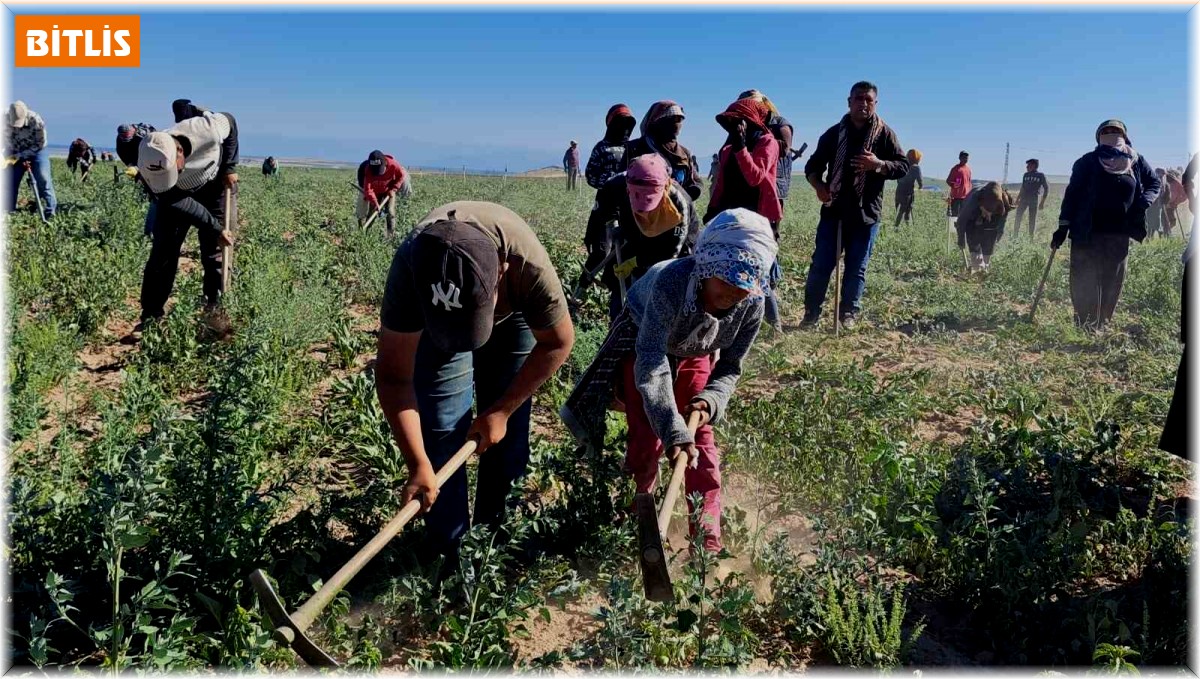 Bitlis: Sabahın erken saatlerinde çapa işine başlayan işçiler, akşam geç saatlere kadar çalışıyor. Genç yaşlı evin bütçesine katkı sağlamak için sıcak altında çalışan işçiler için tarlalar ekmek kapısı oldu.