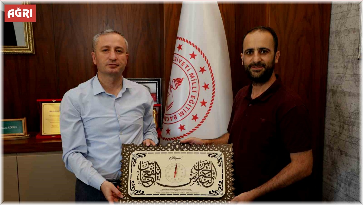 temasıyla gerçekleştirilen Siyer Yarışması için sunduğu katkılardan dolayı Ağrı Peygamber Sevdalıları Derneği Başkanı Arif Yılmaz, beraberinde başkan yardımcısı Fırat Turan ile birlikte İl Milli Eğitim Müdürü Hasan Kökrek'e teşekkür ziyaretinde bulundu.