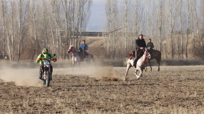 Erzincan - Erzincan'da motokros tutkunları ile atlı sporcular aynı sahada cirit oynadı.