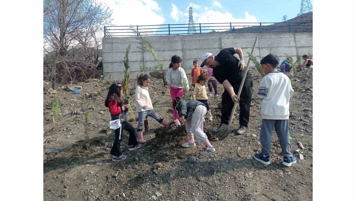 Hakkâri (İHA) - Hakkari'nin Sümbül Mahallesi Muhtarı Ferdi Aksaç, "Geleceğe Nefes" sloganı ile çocuklarla birlikte fidan dikti.