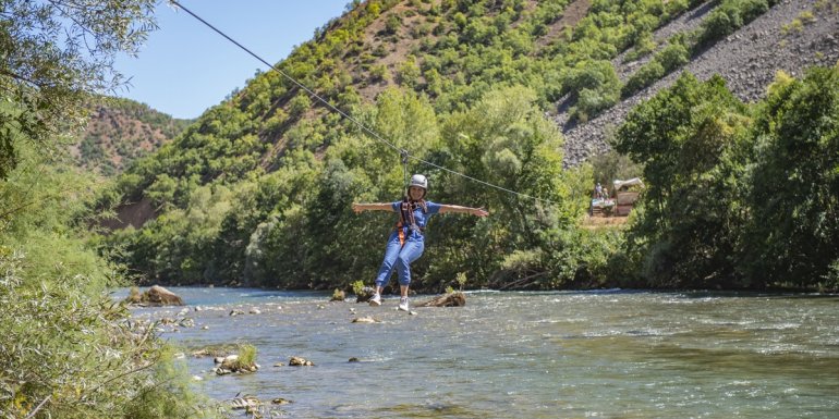 Munzur Çayı üzerindeki zipline hattından kayarken eğlenceli dakikalar geçiren ziyaretçiler, havadayken Munzur Vadisi'nin doğasını da görme fırsatı yakalıyor.