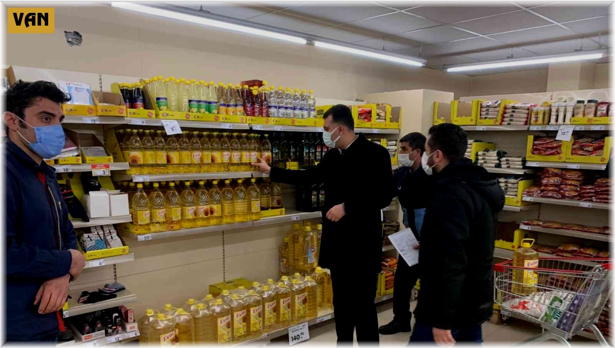 Van: Muradiye'de, stokçuluğun ve fahiş fiyat artışının önlenmesi amacıyla yerel ve zincir marketlerde denetimlerine devam eden ekipler, ürünlerin reyon ve kasa fiyatlarını da karşılaştırdı. Denetime Kaymakam ve Belediye Başkan Vekili Erkan Savar, Tarım ve Orman Müdürü İbrahim Aslanbay, Muradiye Belediyesi zabıta ekipleri katıldı.