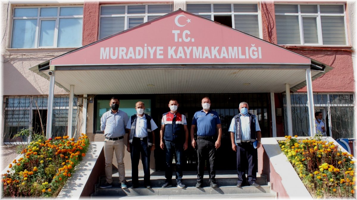 Pandeminin insan sağlığını çok etkilediğini belirten Kaymakam ve Belediye Başkan Vekili Erkan Savar, “Dünyayı ve ülkemizi etkisi altına alan korona virüs salgını her gün can almaya devam ediyor. İlçemizde İçişleri Bakanlığımızın yayımladığı genelge kapsamında denetimlerimizi sıkılaştırarak devam ettiriyoruz. Bu kapsamda yapılan denetimlerde Muradiye Belediyesi Zabıta Müdürlüğü ekiplerimiz, beraberindeki İlçe Emniyet Müdürlüğü, İlçe Jandarma Komutanlığı, İlçe Sosyal Yardımlaşma ve Dayanışma Vakfı ve İlçe Tarım ve Orman Müdürlüğü ekipleriyle aralıksız korona virüs denetimlerini yürütmektedirler. Denetimlerde market, kahvehane, lokanta, pastane, fırın ve kasap gibi birçok iş yeri, hatta sokaklardaki vatandaşlarımız bile uyarılarak gerekli denetimler aralıksız yürütülmektedir. Pandemi nedeniyle bakanlığın yayımladığı kuralları tek tek anlatarak esnaf ile vatandaştan sosyal mesafe, maske ve hijyen kurallarına uymaları konusunda uyarılar yapılarak pandemiden kurtulmanın tek yolunun gerekli aşıların yapılmasından geçtiğini anlatarak uyarılar yapılmaktadır. Toplum olarak kurallara uyarak gerekli aşılarımız yaptırarak ancak bu pandemiden kurtulabiliriz. Bu kapsamda pandemi süresince denetimlerimiz aralıksız devam ediyor, etmeye de devam edecektir” dedi.