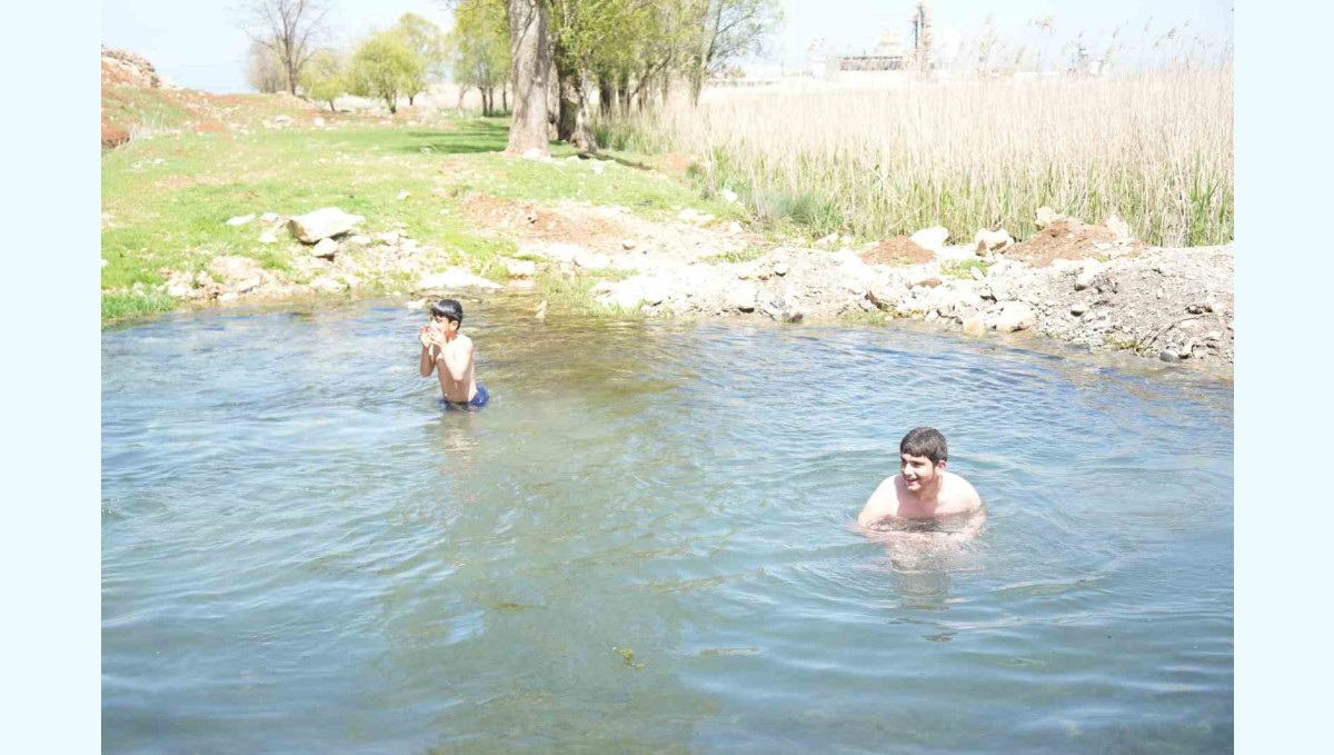 Kaynak suyunun aktığı bölgede doğal olarak oluşan gölette yüzen çocuklardan Yusuf Emre Kurtoğlu, "Su soğuk ama biz yüzmeyi seviyoruz. Soğuk sıcak dinlemiyoruz, her zaman burada yüzüyoruz. Biz yüzmeyi seviyoruz" şeklinde konuştu.