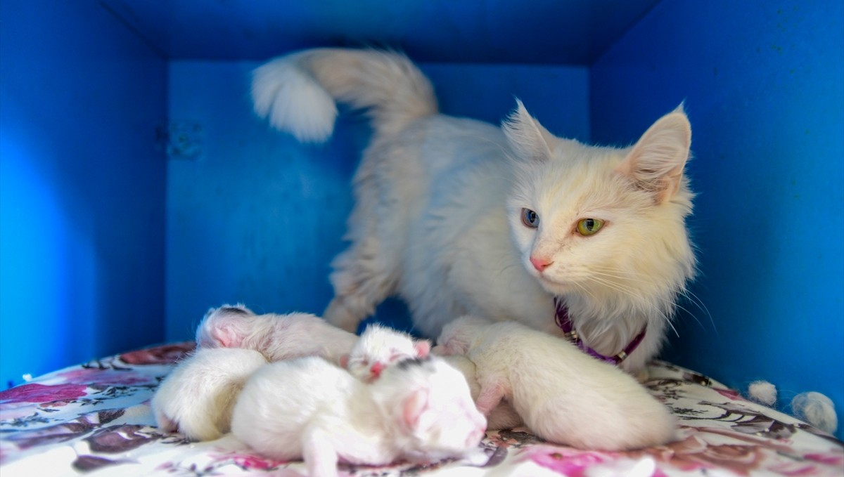 VAN (AA) - YILMAZ KAZANDIOĞLU - Van Yüzüncü Yıl Üniversitesi (YYÜ) Van Kedisi Araştırma ve Uygulama Merkezinde koruma altında bulunan ve uluslararası yarışmada birinci seçilen Van kedilerinden "Su", 5 yavru dünyaya getirdi.
