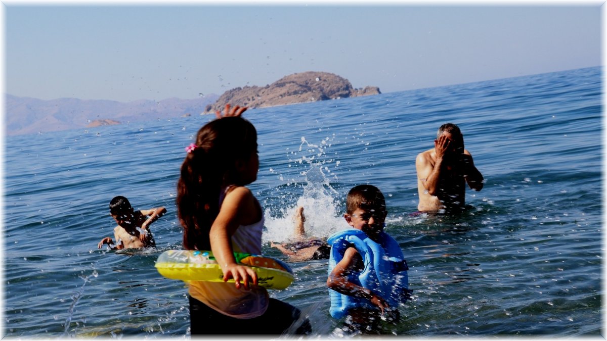 VAN - ’Van Denizi’ olarak nitelendirilen ve Türkiye’nin en büyük gölü olan Van Gölü kıyı kesimi, eylül ayında da yüzme keyfi yaşamak isteyenlerin adresi haline geldi. Van Gölü’nün kıyı kesimlerinde vatandaşlar çocuklarıyla birlikte yüzmenin tadını doyasıya çıkarıyor. Eylül ayının ortalarında Van Gölü’ne giren vatandaşlar bir yandan serinlerken, bir yandan da piknik yapmanın keyfini yaşadı.