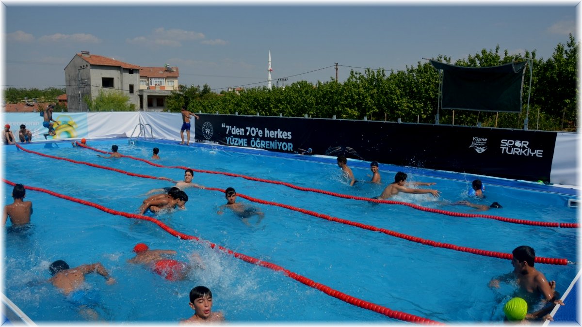 Malatya - Gençlik ve Spor Bakanlığı tarafından Battalgazi İlçesi Melekbaba Mahallesi'ne yaptırılan portatif yüzme havuzu hizmete açıldı. Yüzme bilmeyen kalmasın projesi ile Malatyalı çocuk ve gençler hem eğleniyor, hem serinliyor hem de yüzmeyi öğreniyor.
