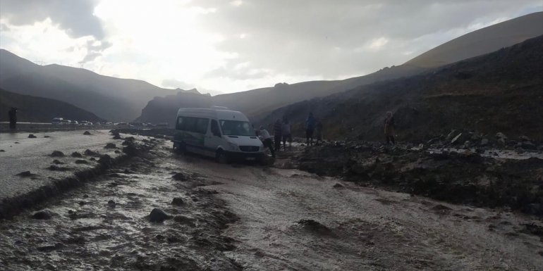 Yüksek kesimlerden sel sularıyla gelen taş ve toprak yığınları Van-Hakkari kara yolunu ulaşıma kapattı.