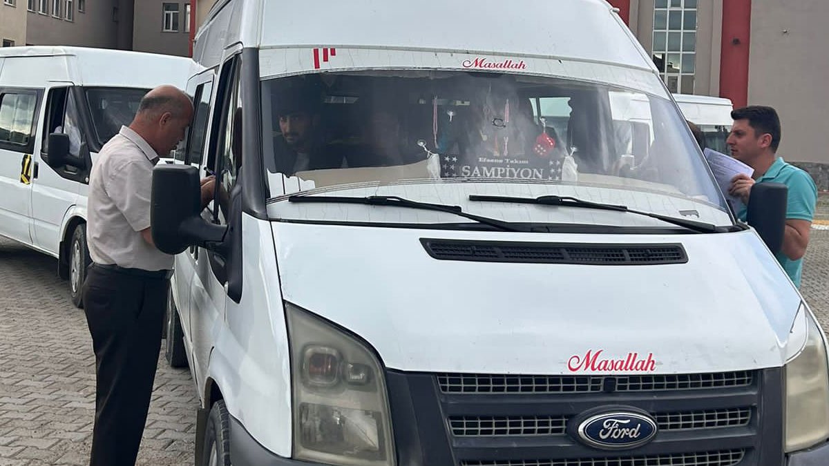 Selahaddin Eyyubi İlk/Ortaokulu'na taşımalı sistemle gelen öğrencilerin ulaşımında kullanılan servislerin güvenlik ve uygunluk kontrolleri sahada incelendi.