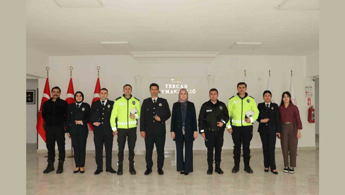 Erzincan'ın Tercan ilçesinde Türk Polis Teşkilatının 180. kuruluş yıl dönümü ve Polis Haftası münasebetiyle İlçe Emniyet Müdürlüğü personeli tarafından Kaymakamlık bahçesinde bulunan Atatürk anıtına çelenk bırakma töreni düzenlendi. İlçe Emniyet Müdürlüğü personeli Kaymakam Neslihan Kısa Duman'ı makamında ziyaret ettiler.