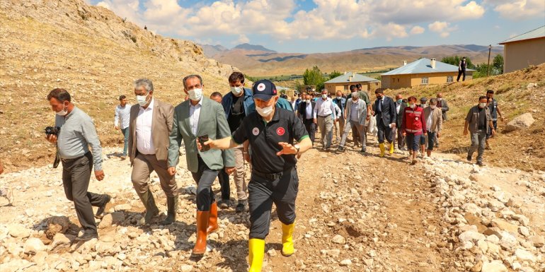 "Cumhurbaşkanımızın talimatlarıyla bölgeye intikal ettik. Üç gündür sel bölgesindeyiz. İpekyolu, Gürpınar ve Başkale ilçelerinde incelemelerde bulunduk. Vatandaşlarımızla hemhal olduk, dertlerini dinledik, mağduriyetleri yerinde gördük. Olayı yerinde görmek ve incelemek çok faydalı bir tespit çalışması oldu. Yapılan çalışmalar neticesinde Başkale'de 64, Çaldıran'da 30, Özalp'ta 6 ağır hasarlı ev tespit edildi. Bu sayı kesin değil. Hasar tespit çalışmaları devam ediyor. TOKİ en kısa sürede bu evleri yeniden ihya edip vatandaşlarımıza teslim edecek. Yol ve suyun akış yönü konusunda çalışmalarımız DSİ ile yürütülecektir. DSİ sahada çalışmalarını sürdürüyor. Çalışmalarımız tespit mahiyetindedir. Tespitler sonucunda bir aylık askı süresi var. Askı süresi tamamlandıktan sonra TOKİ marifetiyle burada hasara uğrayan binalar yeniden ihya edilecek, vatandaşlarımıza teslim edilecektir."