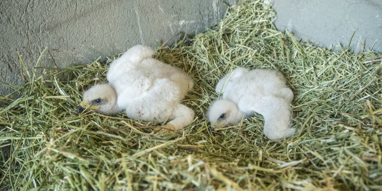 Saman ve ağaç dallarından yapılan yuvada kalan kartalları, görevliler her gün kırmızı etle besliyor.