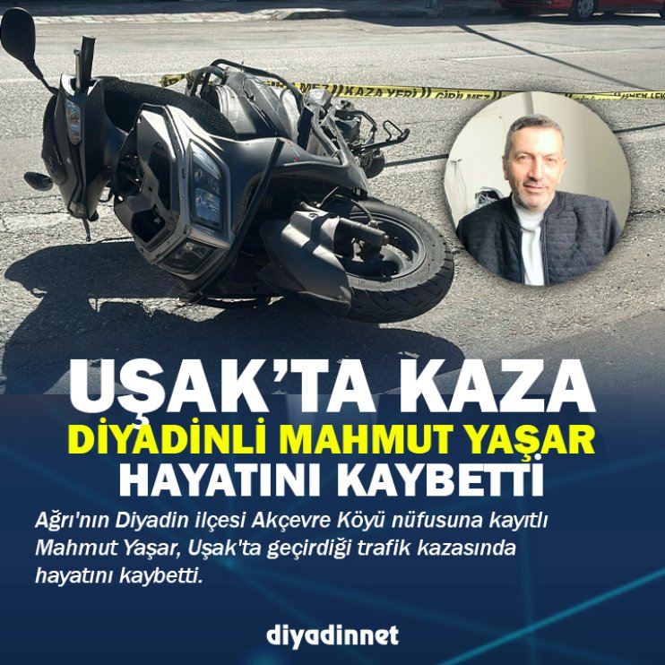 Uşak’ta hafif ticari araç ile motosikletin çarpışması sonucu meydana gelen trafik kazasında, Ağrı’nın Diyadin ilçesi nüfusuna kayıtlı Mahmut Yaşar (56) yaşamını yitirdi.