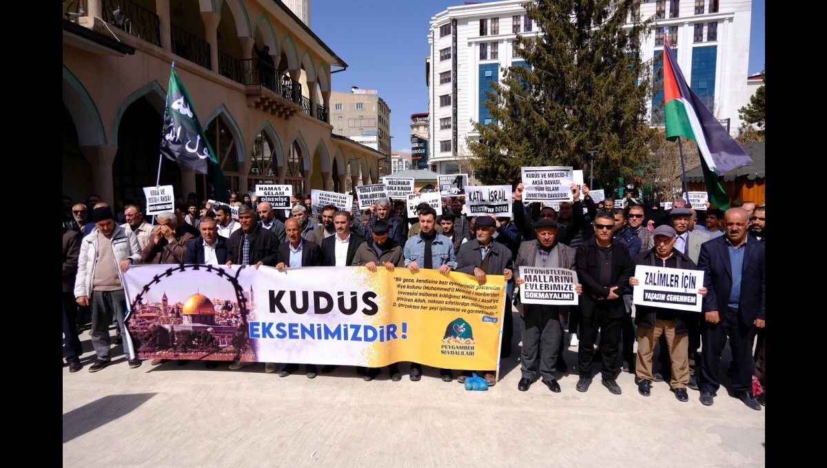 VAN (İHA) - Hazreti Ömer Camii önünde, Cuma namazı çıkışında düzenlenen açıklamayı Peygamber Sevdalıları Van İl Koordinatörü Ahmet Faruk Çevik okudu. Kudüs'ün Müslümanların onur ve izzetini temsil ettiğini ifade eden Çevik, siyonist işgalcilerin Filistin halkına yıllardır zulmettiğini söyledi.