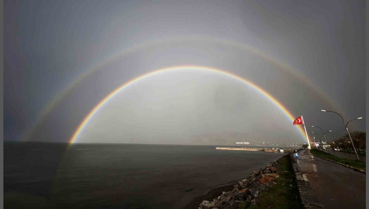 Bitlis'in Tatvan ilçesinde etkili olan sağanak yağışın ardından gökyüzünde belirlenen çift gökkuşağı, izleyenleri büyüledi.