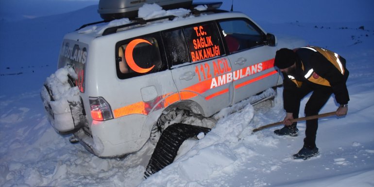 Paletli ambulanstaki kontrollerin ardından hasta, ilçe hastanesine getirilmek üzere yola çıkarıldığı sırada tipi nedeniyle kar birikintilerinin olduğu yolda araç yaklaşık 2 metrelik karda batarak askıda kaldı.