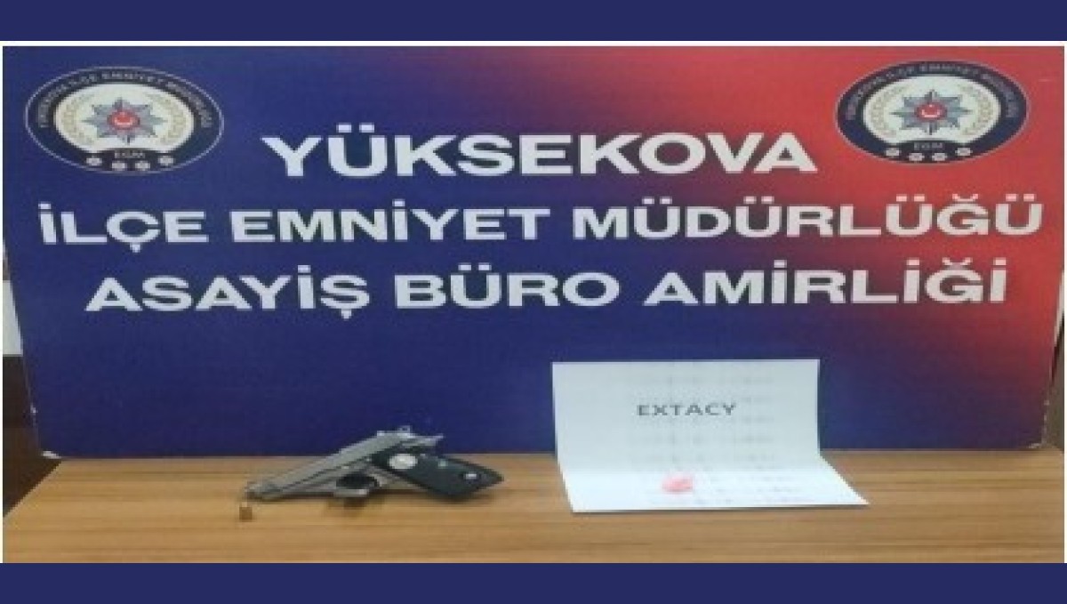 HAKKARİ (İHA) - Hakkari Emniyet Müdürlüğü ekiplerince Yüksekova ilçesinde yapılan rutin uygulamada, bir şahsın üst araması yapıldı. Aramada, şahsın üzerinde 1 adet ruhsatsız tabanca, tabancaya ait 1 adet 7.65 fişek ve 2 adet extasy olarak tabir edilen uyuşturucu madde ele geçirildi. Şüpheli şahıs ile ilgili gerekli yasal işlemlerin başlatıldığı belirtildi.
